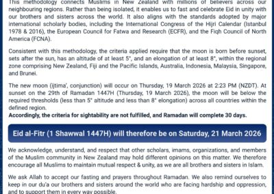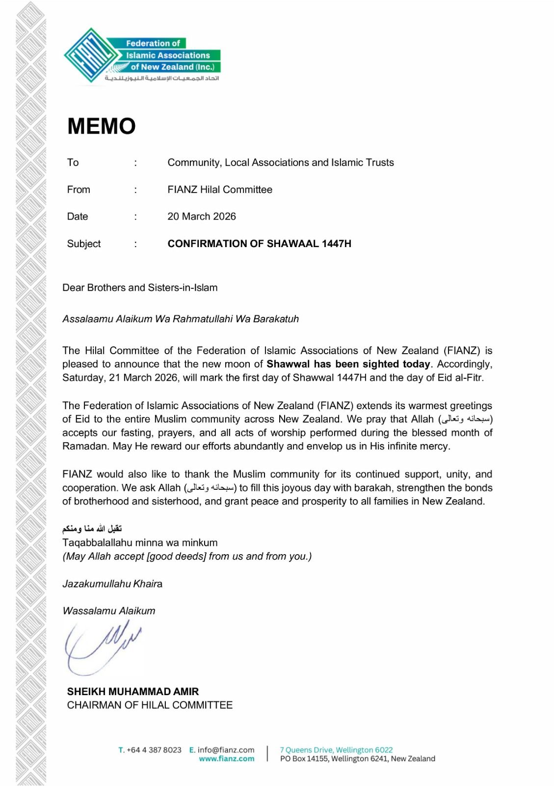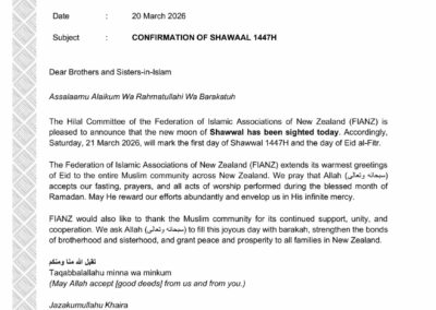 Holy month of Ramadan (Ramjan) 1447H started from Friday, 20 Feb 2026 as per FIANZ announcement
