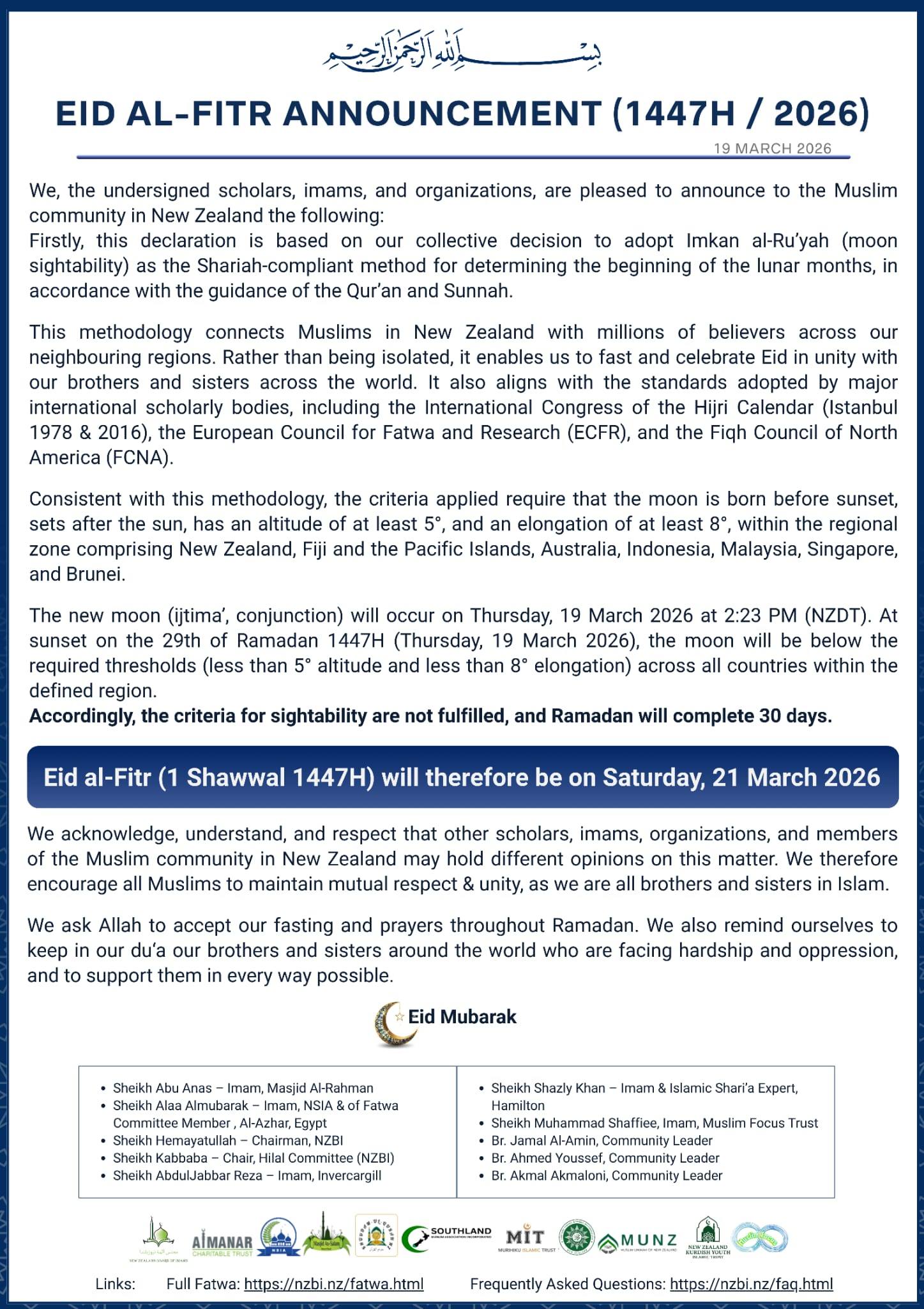 Eid Al Fitr 2026 in New Zealand: 21 Mar as per announcements